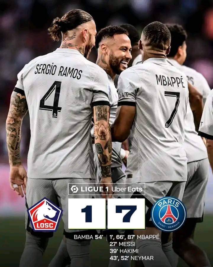 #Ligue1_uber_eats : “Paris inscrit sept buts et s’impose facilement sur la pelouse des Dogues”Le Paris Saint-Germain continue son début de saison parfait. Après les larges victoires face à Clermont (5-0) et Montpellier (5-2), le champion de France en titre a écrasé Lille (7-1) ce dimanche en clôture de la 3e journée de Ligue 1.Dans une chaude ambiance à la Decathlon Arena, le PSG calmait immédiatement les fans lillois avec l’ouverture du score de Mbappé, auteur d’un lob, sur une combinaison après l’engagement (0-1, 1e) ! Incroyable après 8 secondes ! le PSG ont ensuite tranquillement déroulé avec des buts signés Messi (0-2, 28e), Hakimi (0-3, 39e), Neymar (0-4, 44e), Neymar (0-5, 53e), Mbappé (1-6, 67e) et Mbappé (1-7, 87e). Un véritable calvaire pour Lille… Mais dans la foulée, les hommes de Fonseca parvenaient à sauver l’honneur avec un but de Bamba, qui s’y reprenait par deux fois devant Donnarumma (1-5, 55e).Trop facile !