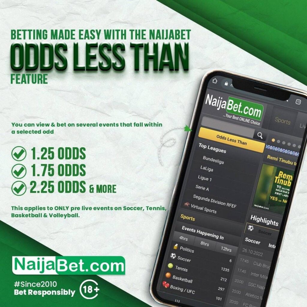 Betting Just got easier on NaijaBet with the Unique Feature ‘ODDS LESS THAN’, this unique feature is specially designed for our users to provide a seamless betting experience.